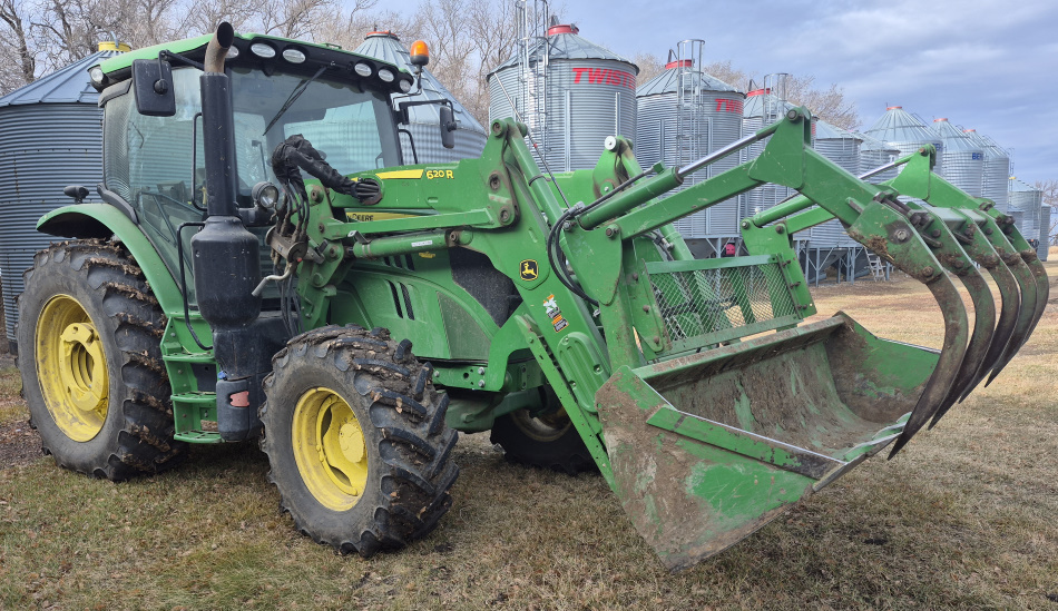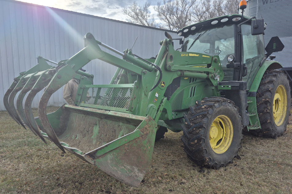 - *2017 John Deere #6130R MFWA tractor, JD 620R FEL, 8' bucket & grapple, 3PH,