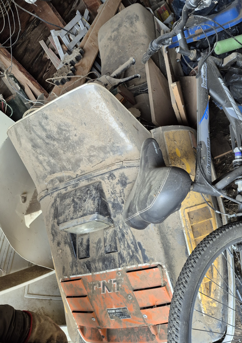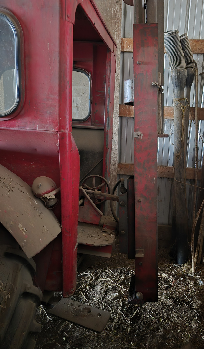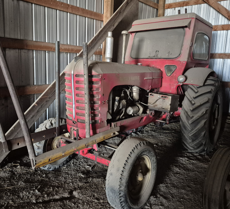- *Massey Harris #444 tractor, cab, mounted post pounder on the back